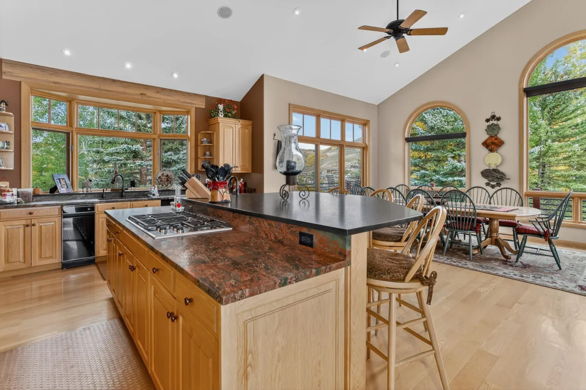 This custom home was built by Ted Colvin, and offered fully furnished. You will love the spacious great room with vaulted ceilings – the gourmet kitchen, dining area and large living room area with wet bar, that opens to expansive decks for seamless indoor-outdoor living. The three-sided stone woodburning fireplace is a great centerpiece to the room.